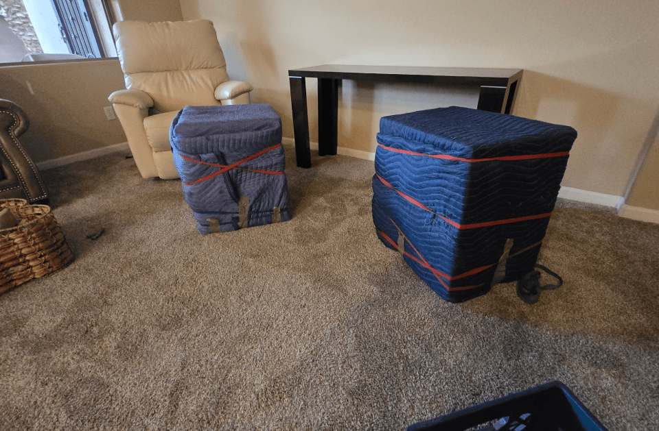 Furniture moving techniques reduce risk through padding, wrapping, and controlled movement.